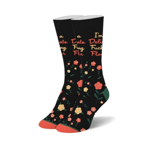 Pair of black crew socks with a scattered coral flower pattern and a playful text overlay.  The text says 'I'm a Delicate Flower'. }}