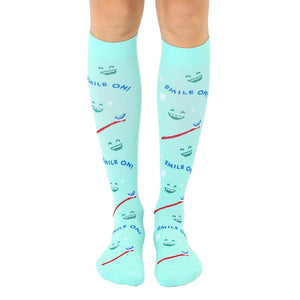 Tooth-tally awesome socks to make you smile wide and show off your pearly whites! These knee-high mint green socks feature a cheerful pattern of cartoonish smiling teeth, complete with a toothbrush and the encouraging words "SMILE ON!". Perfect for dentists, dental hygienists, orthodontic assistants, or anyone who loves to keep their teeth healthy and bright. These socks will brighten up your day and make you the life of the party, whether you're at the office, running errands, or just lounging at home. Available in sizes for both men and women, so the whole family can flash their pearly whites in style.