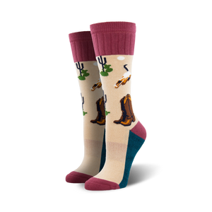 Step into the wild, wild West with these rodeo-ready, beige-colored boot socks with pink accents featuring a bold pattern of cowboy boots, cacti, and skulls - a great addition to any sock drawer. Cowgirl up and strut your desert-inspired style everywhere you go.