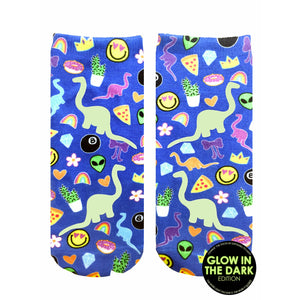 Sure, here's a fun and light-hearted description for the novelty socks: Embrace the chaos with our "Dino Madness Glow" socks! These ankle socks for women are a technicolor explosion. Blue socks are highlighted with glow-in-the-dark dinosaurs, flowers, hearts, aliens, bows, smiley faces, crowns, pizza, cacti, 8-balls, and rainbows. Just like a dino-mite party on your feet! Wear them under rain boots, sneakers, or sandals and be prepared to turn heads. The vivid dinos glow when the lights go low like something out of Jurassic Park! Get ready to stomp, roar, and explore in style.