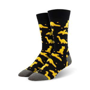Fancy a snack that's both fashionable and delicious? Treat your feet to Dino Nuggets crew socks! These fun socks feature a pattern of yellow chicken nugget-shaped dinosaurs. Much like its namesake, these socks are made for eatin' (just not literally!).