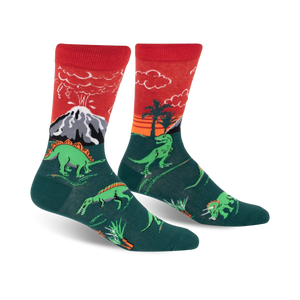 Dinosaur Days Glow socks feature a gray, brown, and green trio of dinos set against a backdrop of lush green grass, vibrant yellow flowers, a glowing red sun, and a puffy white cloud. Get ready to stomp through your day with a smile on your face and a prehistoric pep in your step. The perfect addition to any dinosaur enthusiast's sock drawer.