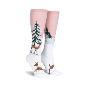 These knee-high socks are just what you need for the winter season! A playful deer, wrapped in a cute pink scarf, frolics in the snowy design, while shimmering threads add a touch of sparkle. Cozy, fun, and full of festive charm!