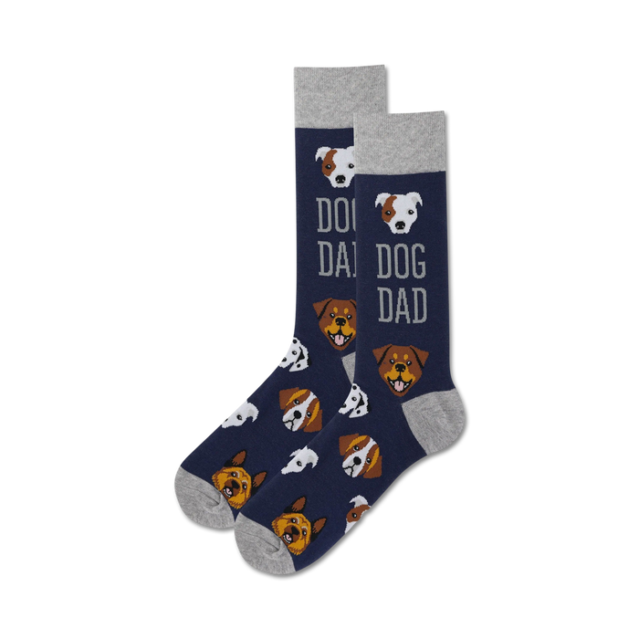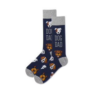 Picture the coolest pup-lovin' guy ever rocking these amazing pair of blue crew socks with gray toes, heels, and cuffs. They feature a pack of adorable cartoon dogs in various breeds and the bold, gray text "DOG DAD" sprawled across them. Get ready to show off your love for dogs and start a conversation with every dog dad you meet. Wear these socks and prepare for tail-wagging compliments wherever you go!