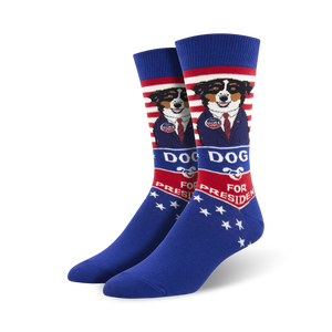 Cartoon man's best friend campaigns for the highest office in the land in these Vote Dog for President crew socks! Strut your support for democracy and the right for all doggos to chase squirrels in these humorous, patriotic socks, starring the cutest candidate you've ever seen. Socks are blue with red and white stripes and stars at the top, a cartoon dog wearing a suit and tie on each sock, and "Dog for President" emblazoned below. Paw-sitively a fun way to engage in our democratic paw-cess!