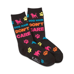 You can now proudly show off your love for dogs with these "Dog Hair Don't Care" socks, featuring bright paw prints and adorable dog silhouettes. These socks will make you grin from ear to ear because they have a simple black background with the words "DOG HAIR DON'T CARE" printed in colorful letters. Embrace your furry friend's mess and let the world know that you don't mind the dog hair.