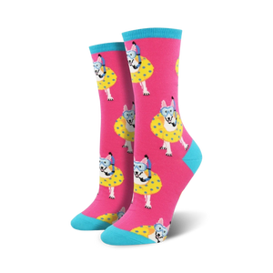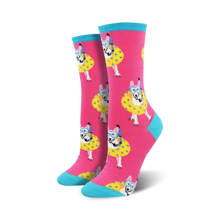 Goodbye winter, hello summer! If you and your dog are ready for some fun in the sun, slip on a pair of these funny women's novelty socks. Each cool pair features bull terriers wearing a snorkeling mask, floating around in polka-dotted a swim rings printed over against on an aqua green background. The cuffs, heels, and toe lines are blue.