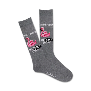 Don't let these socks take you for a wild goose chase, they're the real deal! Bright pink flamingos with shades and the text "Don't flock with me today" adorn these gray crew socks. Perfect for the man who wants to strut his stuff and make a 'flock' of a statement. Flamingo socks that say 'Don't Flock With Me Today' for the man who calls the shots.