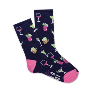 Sip into style with these spirited blue Don't Give a Sip socks! Featuring a playful pattern of wine glasses, martini glasses, cocktail glasses, lime wedges, and mint sprigs, they're the perfect accessory for any happy hour. The bold pink lettering on the top of the sock declares your stance on sipping, "I Don't Give a Sip." Slip on a pair of these crew-length socks and raise a glass to fun and fashion, with a slice of sass!