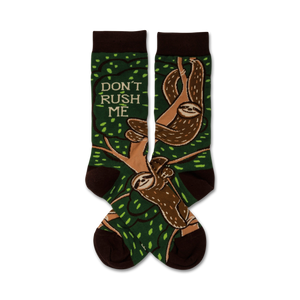 Sloths are the ultimate chillers, known for their laid-back attitude and slow-paced life. Step into a pair of these brown and green Don't Rush Me sloth socks, featuring adorable sloths hanging from tree branches, and let the sloth vibes take over. Whether you're lounging at home or out running errands, these comfy crew socks will keep you cozy and remind you to take it easy. So, slow down, embrace the sloth life, and say "Don't Rush Me" with every step.