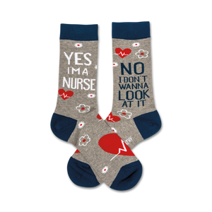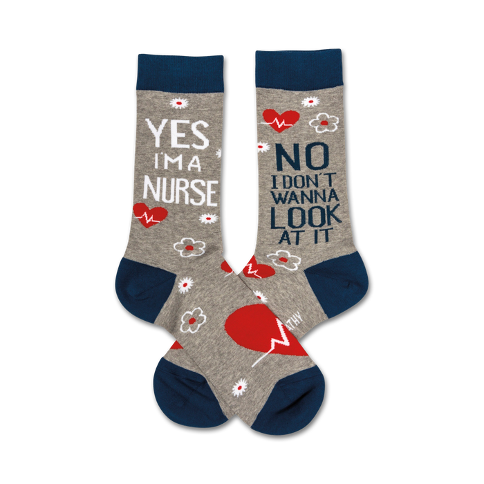 You may not be able to save a life today, but you can save your style by slipping into these "Don't Wanna Look" nursing socks. With the bold message "YES I'M A NURSE...NO I DON'T WANNA LOOK AT IT" emblazoned on the sides, these sassy gray socks with blue toes, heels, and tops will leave no doubt about your love for your job and your sense of humor. And if that's not enough to brighten your day, the smattering of white flowers and red hearts with white polka dots will surely do the trick!