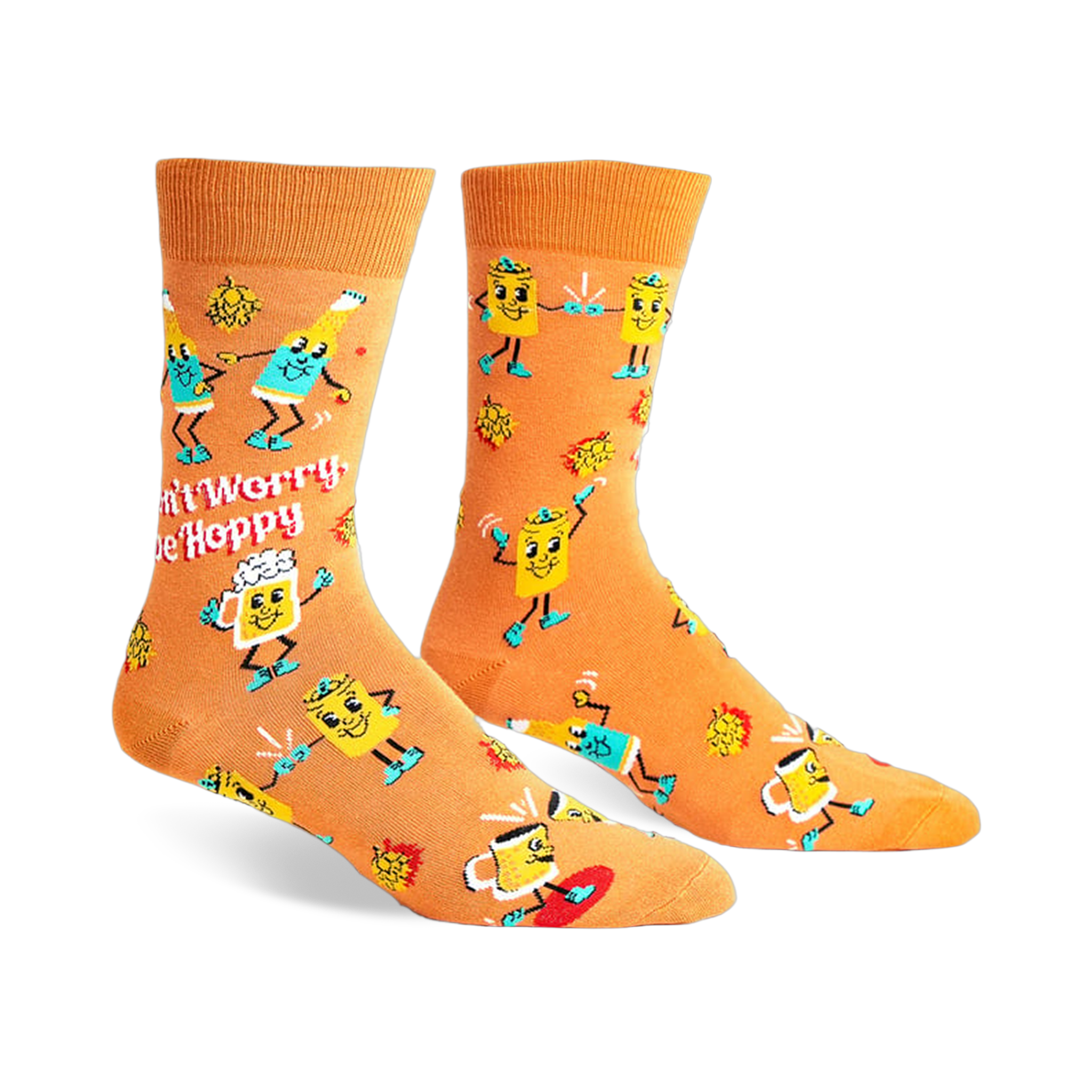 With a parade of smiling mugs, foamy tops, and little hops scattered across the fabric, these men's crew socks bring pub humor to everyday dressing without trying too hard. The design has a playful, animated feel, like a bar sign that wandered off and learned how to dance. They manage to be funny, but still tidy enough to wear with jeans, shorts, or the kind of casual clothes that could use a bit more personality.