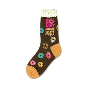 Who doesn't love donuts, right? Donut Judge Me socks are the sweetest way to tell the world to lay off. A pair of soft, cozy crew socks for women in a light brown color features a funfetti donut pattern. The socks are topped off with a fun, bright pink and purple text that reads, "Donut Judge Me." These socks are just the thing to brighten up your day and get some laughs from your friends.