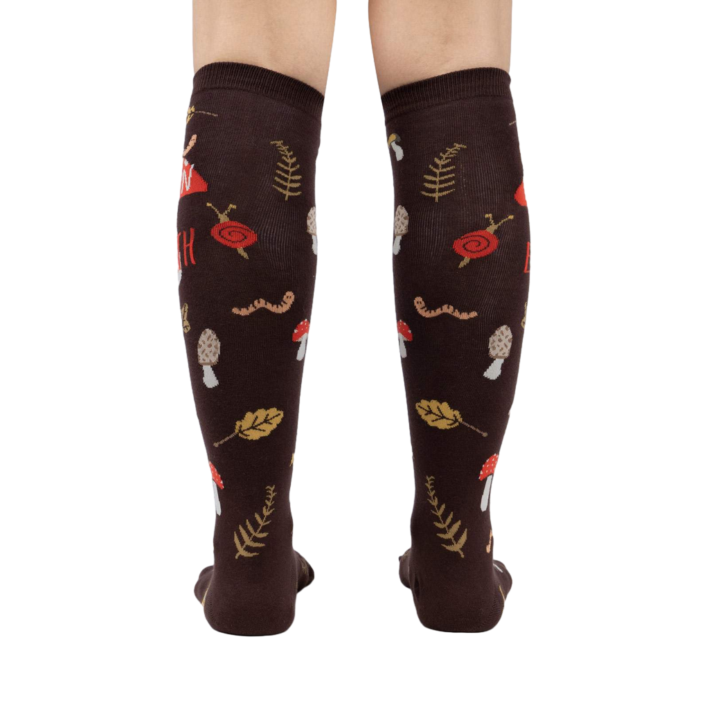 Take a hike with your feet and enter a botanical wonderland of mushrooms, leaves, snails, and worms in Down to Earth knee-high socks made especially for women. Dig deep into the soft fabric, feel the high-quality stitching, and let your feet run free! Feel at home with these Down to Earth socks, because they'll never leave you high and dry.
