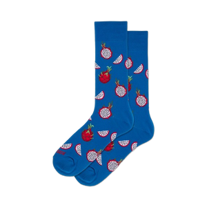 Put some pep in your step and show off your sweet tooth with these Dragon Fruit Socks! Featuring a bold pattern of juicy red dragon fruit against a vibrant blue background, these socks are sure to turn heads and make you the life of the party. Let everyone know that you're as sweet as a dragon fruit and just as fun and energetic!