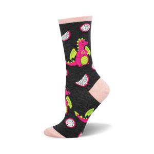 Dragonfruit is not just a fruit; it's a work of art, blending fiery pinks and purples that seem to have sprung from a fairytale. Now, imagine that vibrant palette transformed into socks! These dark gray crew socks, adorned with playful pink dragons and juicy dragonfruit slices, serve up a delightful splash of color and whimsy that promises to brighten your day. Perfect for those who appreciate the fusion of fantasy and fashion, these socks are a fun and fruity way to add some zest to your wardrobe.