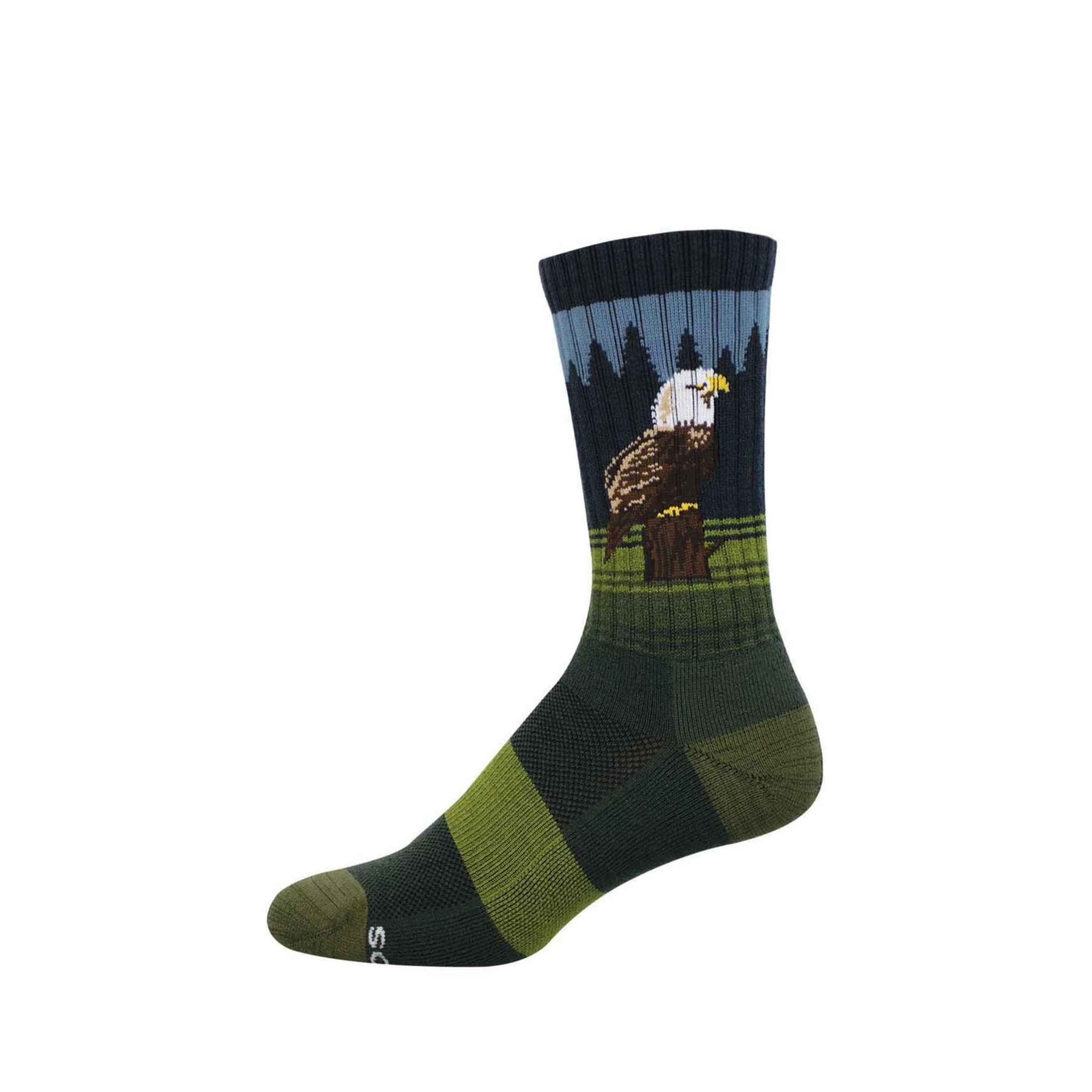 These men's crew socks bring a quiet slice of wilderness to the everyday. A bald eagle stands proud on a weathered stump, framed by a line of pines and a dusky sky that gives the whole scene a calm, outdoorsy feel. The design has the look of a classic nature illustration translated onto a pair of socks, with enough detail to catch the eye without shouting for attention.