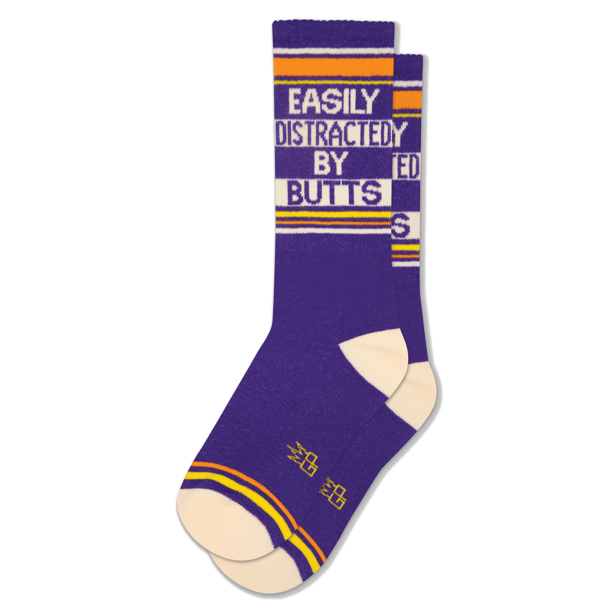 A bold purple sets the stage for these socks, ready to make a statement. Near the top, there's a cool stripe pattern with a thick orange band, then thinner white and purple lines. The main event is the white text 'EASILY DISTRACTED BY BUTTS' spread across the calf. The word 'BUTTS' itself sits on a light cream-colored band that's framed by thin orange and purple stripes. Down near the foot, you'll spot cream-colored toes and heels, plus a couple of orange and yellow stripes just above the sole. These are definitely a fun pair if you appreciate a little cheeky humor.