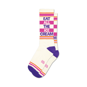 If ice cream is your sweet vice and socks your thing, our 'Eat All The Ice Cream' socks will be the cherry on top of your sundae. Your feet will do a dance in your favorite chunky kicks when they get a load of these white socks splashed with purple toes, heels, and cuffs, 2 orange stripes, and the words 'Eat All The Ice Cream' in purple and pink. You're welcome.