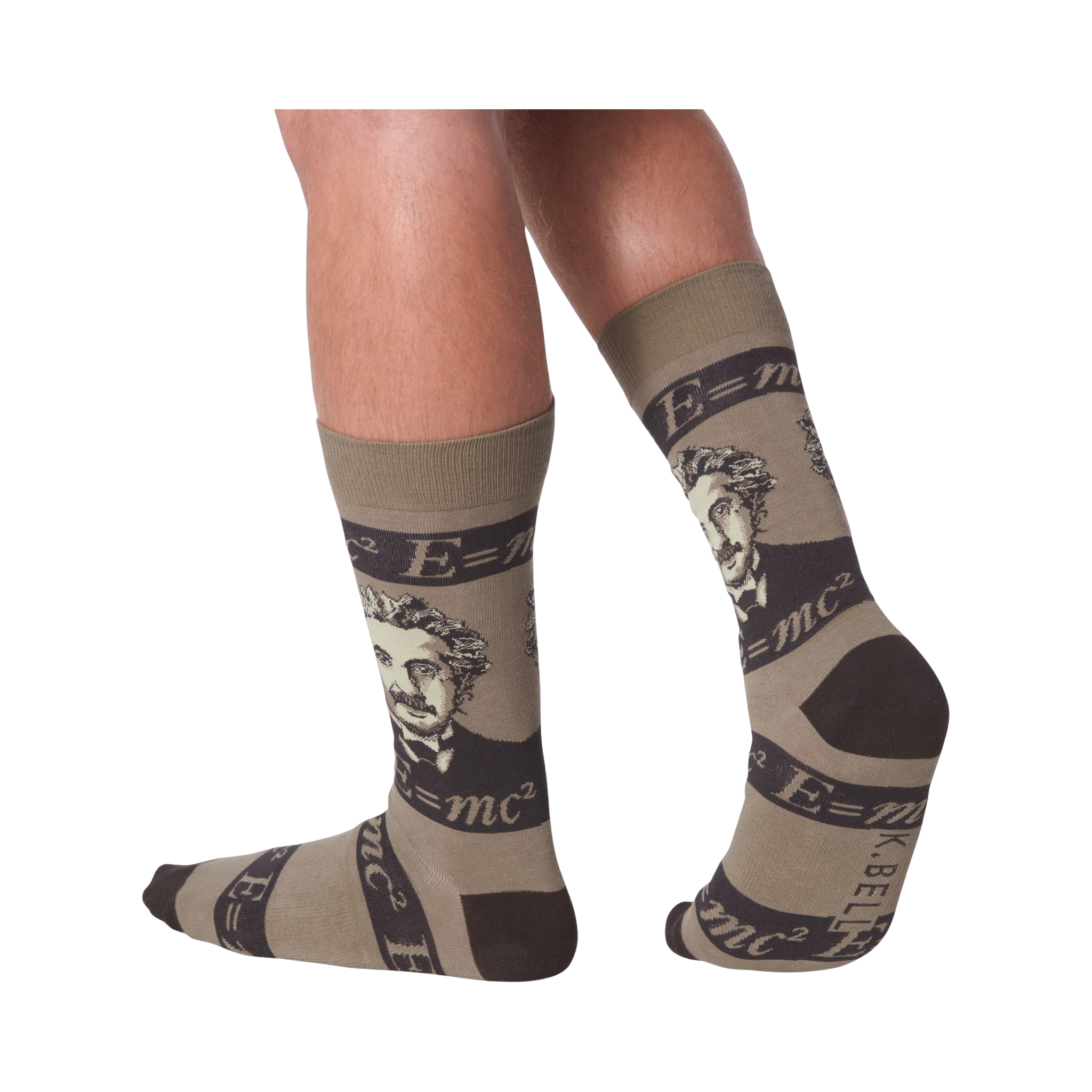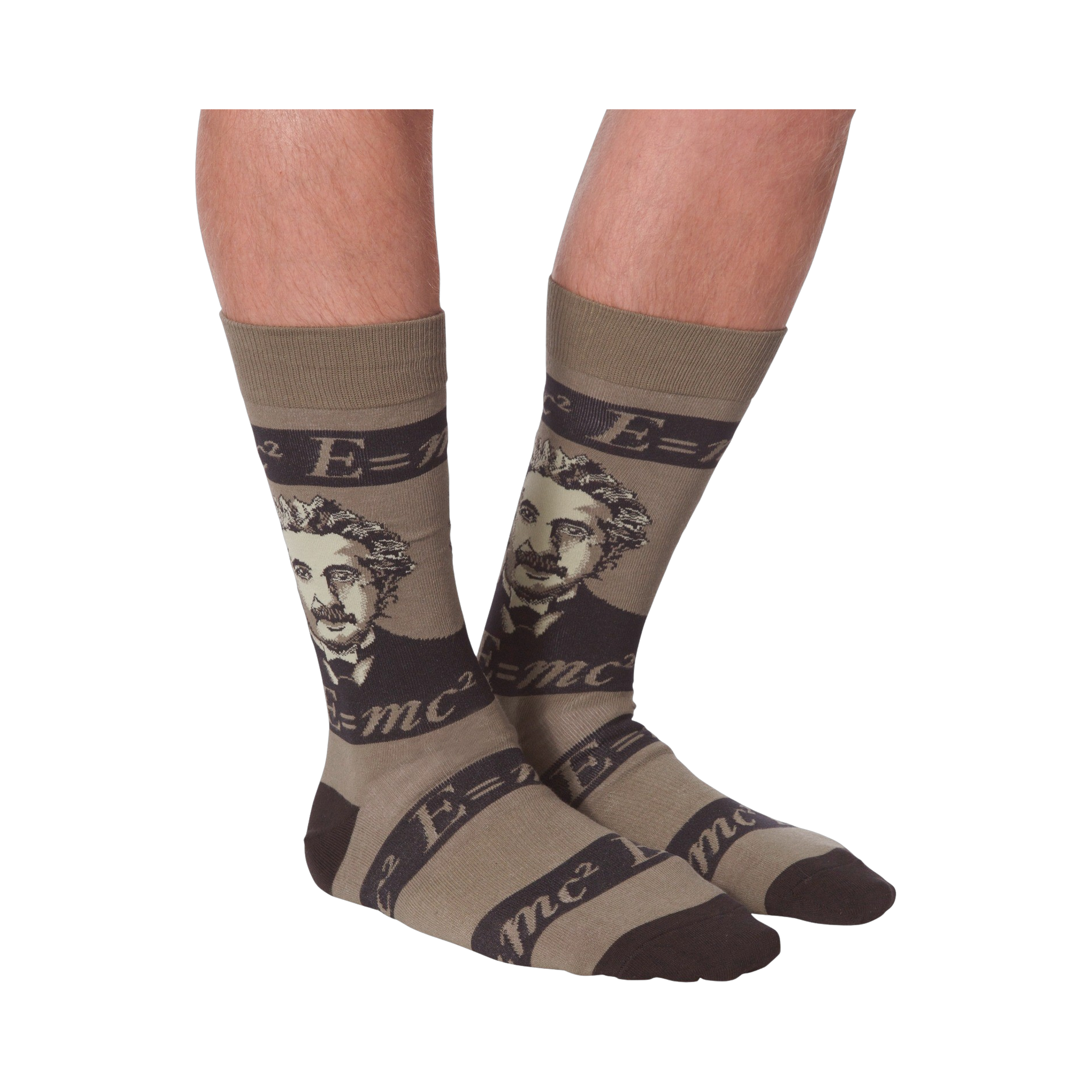 Einstein Socks: Embrace the Genius with Every Step Put on a pair of Einstein socks, and elevate your sock game to the next level! These olive green marvels feature a vibrant pattern of Einstein's iconic face framed by his legendary equation, E=mc2 Show off your admiration for the brilliant mind while adding a touch of wit to your everyday style. Remember, with these socks on, you're not just wearing footwear; you're making a statement about intelligence, curiosity, and the limitless power of the human brain. Step out with confidence, knowing you've got Einstein's genius on your feet.
