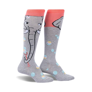 Get your feet into some hilarious Elephantastic! knee-high socks! These gray socks feature a pattern of pink and blue bubbles with playful elephants blowing bubbles. The pink cuffs add a touch of whimsy. Wear them and let your feet run wild!