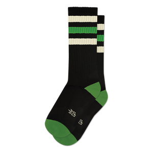 The Elroy Retro socks bring back those classic athletic vibes, but with a fresh twist. A solid black crew sock, it features bold horizontal stripes around the cuff that really stand out. You'll see vibrant green bands alternating with crisp white ones, giving them that unmistakable old-school look. The toe and heel sections pop with a bright lime green, adding a cool contrast to the black. There's also a small, abstract white symbol visible near the ankle on the side. They're a straightforward way to add some timeless, sporty style to your daily rotation.