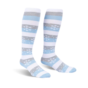 These Every One is Unique Christmas socks will bring a smile to your face and those around you. The knee-high wide calf socks feature white bases with light blue and gray stripes. Tiny blue snowflakes dot the background and send a cool, frosty feeling up and down your legs. Wear these socks for a fun twist on the classic Christmas sock and stand out from the crowd this holiday season.