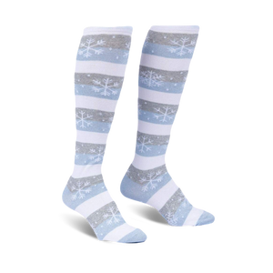 Every snowflake is unique, just like you! These knee-high socks are festive, cozy, and perfect to keep your feet happy this holiday. White with light blue and gray stripes and snowflakes. Pairs great with a hot cup of cocoa and a good book. You'll love wearing these socks around the house or out and about.