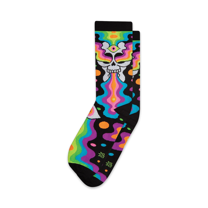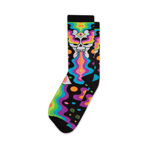 Prepare to have your feet dazzled by Eye of The Doomed! These ultra-long crew socks are designed to transport you to another dimension with their black background and colorful skull pattern. Each skull boasts rainbow-colored eyes and mouths, surrounded by hypnotic swirls and shapes. Wear these socks and find yourself at the center of psychedelic awesomeness. They're perfect for anyone who wants to add a touch of whimsy and enchantment to their everyday style, guaranteed to make dull days disappear faster than a ghost. Embrace the spirit of the damned and step into Eye of The Doomed socks today!