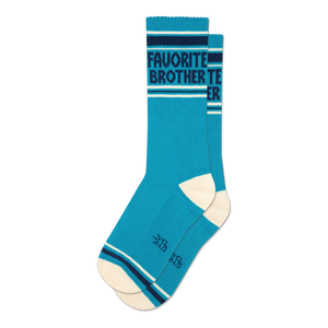 Let everyone know who the real MVP of the family is with these bright teal socks. They feature 'FAVORITE BROTHER' prominently displayed in a bold, dark blue text around the ankle. Just above and below the lettering, you'll see clean, horizontal stripes in dark blue and white, giving them a sharp, athletic-inspired look. The main body of the sock is a vibrant teal, while the heel and toe sections are finished in a contrasting off-white color. There are also small, dark blue symbols visible on the side of the foot. These are just the right socks to comfortably announce your top-tier sibling status.