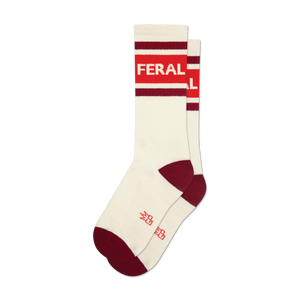 Time to let your wild side out, starting from the ground up. These socks feature a creamy, off-white base with bold red stripes around the top cuff. Right in the middle of those stripes, you'll see "FERAL" spelled out in white letters, making a clear statement. The heels and toes are a deep red, matching the stripes and tying the whole look together. There's also a cool, stylized red symbol visible near the arch on one side, adding a little extra detail. They're basically your feet's way of saying, "I run with wolves, but also, I like my feet comfy."