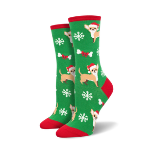 With these Festive Chihuahua socks, you'll be sleighing all day! Their jolly green color with cartoon Chihuahuas wearing Santa hats, snowflakes, and bones will make you the life of the paw-ty. Feel free to paw-mp up your holiday cheer with these crew-length socks meant for women who want to spread Chihuahua joy this Christmas!