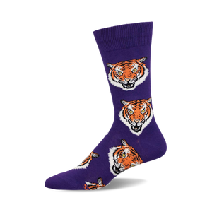 Ever notice how tigers can be both adorable and downright fierce? These purple socks with vibrant orange tiger faces capture that duality perfectly, offering a playful yet bold statement for your feet. The tigers may be baring their teeth, but it's all in good funjust enough to add a touch of wild charisma to your step.
