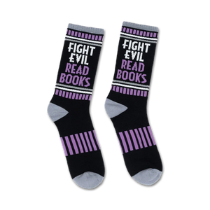 Channel your inner superhero and let your feet do the talking in these "Fight Evil, Read Books" socks! With stripes of purple and gray and bold lettering, these crew socks make a statement about your passions for art, literature, and justice. Perfect for men and women who aren't afraid to show their love for reading and saving the day, one sock at a time.