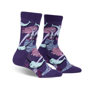 Dive into the magical underwater world with our Fin Friends socks! These purple crew socks are adorned with enchanting mermaids rocking pink hair and vibrant flower crowns, swimming alongside majestic narwhals with their captivating pink tusks. With a playful wave pattern completing the scene, these socks are the perfect accessory for your next seaside adventure or a cozy day indoors.