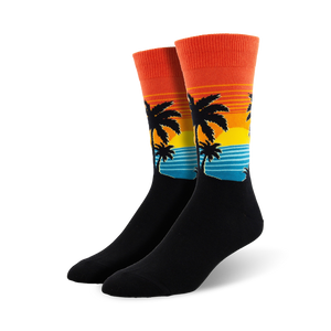Brighten up your feet with our Find Your Beach men's crew socks! Picture the scene: you're walking down the boardwalk, the ocean breeze blowing through your hair, the sound of waves crashing against the shore. The day is perfect, and so are your feet in these comfy socks. The black socks with the orange cuff and palm tree design will have you feeling like you're on vacation even when you're stuck at work.