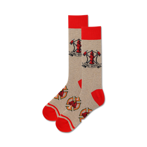 Calling all brave firefighters and fans of the fearless! These Firefighter socks are smokin' hot with their gray design adorned with bold red accents, Maltese crosses, and firefighter axes. Between the crosses and axes, spot the red fire hydrant proudly displaying "Fire-Res-Q". Put on a pair of these foot fighters and feel the fire in your step, because even off-duty, a firefighter never truly hangs up their hat.