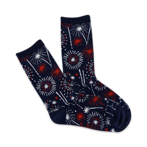 These socks are a patriotic blast! Show your love for the good 'ol U.S. of A with a pair of dark blue socks adorned with a dazzling display of red and white fireworks. Perfect for the 4th of July or any day you want to feel the spark of American pride. They're also super comfy so you can wear them all day long while you're grilling, watching fireworks or just hanging out with friends.