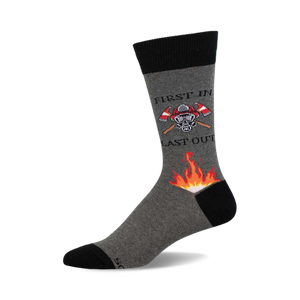 When it comes to firefighting, "First In, Last Out" isn't just a motto, it's a way of life. These grey socks with black trim and a firefighter's crossed axe graphic proudly display the words "First In Last Out," complete with a fiery orange and yellow flame graphic. Whether you're battling blazes or being the life of the party, these socks are ready to support you through it all.
