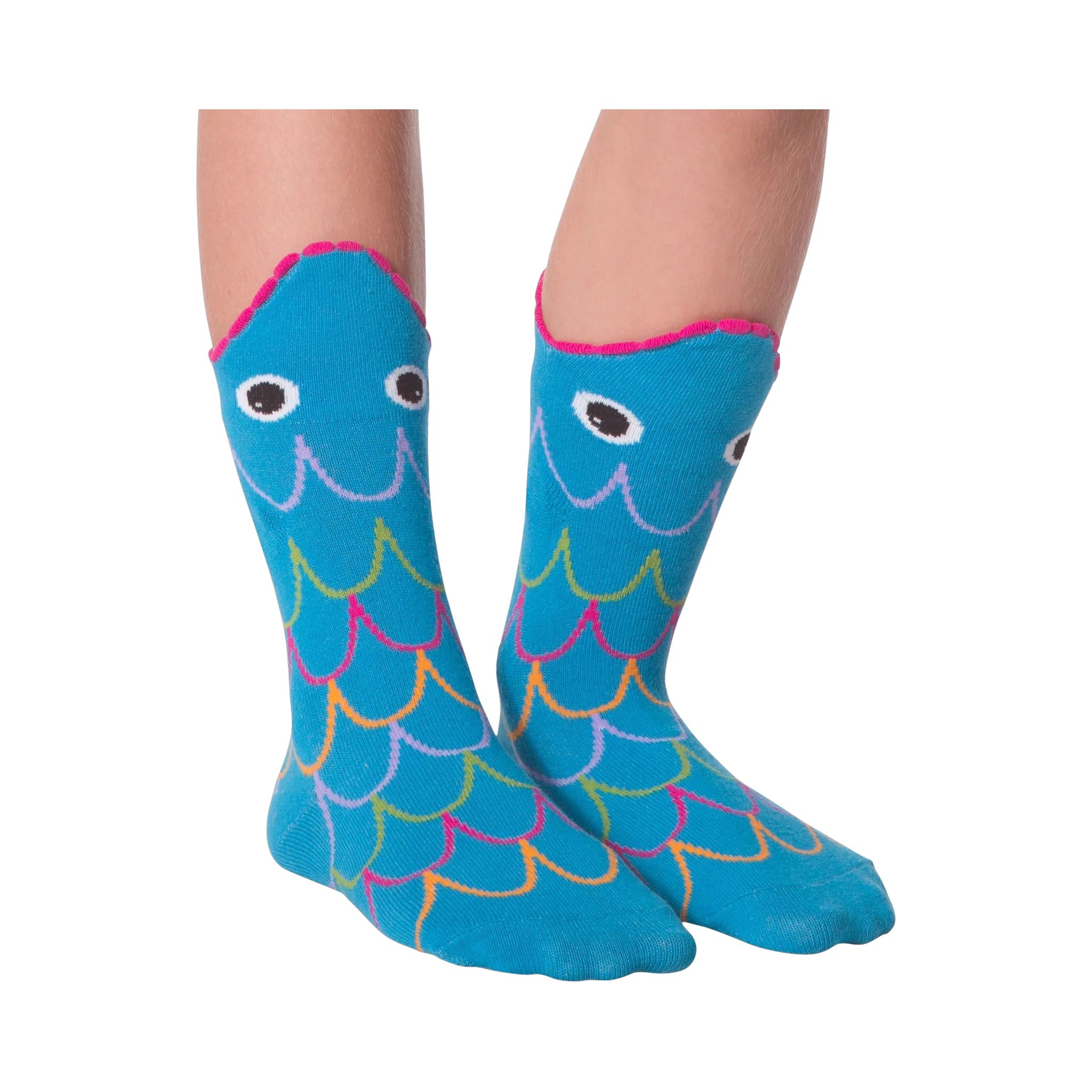 Let your feet swim in style with our Fish Wide Mouth crew socks! Designed with a vibrant pattern of multi-colored fish scales and adorable pink-mouthed fishies with googly eyes, these socks are sure to make a splash wherever you go. Perfect for kids who love the underwater world, these socks will have them swimming in compliments all day long.