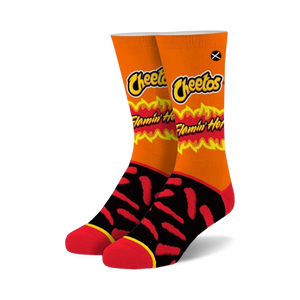 From the cheeseburger of socks, Flamin Hot Cheetos himself! If you love your hot Cheetos, put them on full display with these fuego foot coverings. The orange and black design with red, orange, and yellow flames on the orange part and a Cheetos logo on the black part will surely turn up the heat wherever you go. Plus, feel extra cheesy with every step you take.