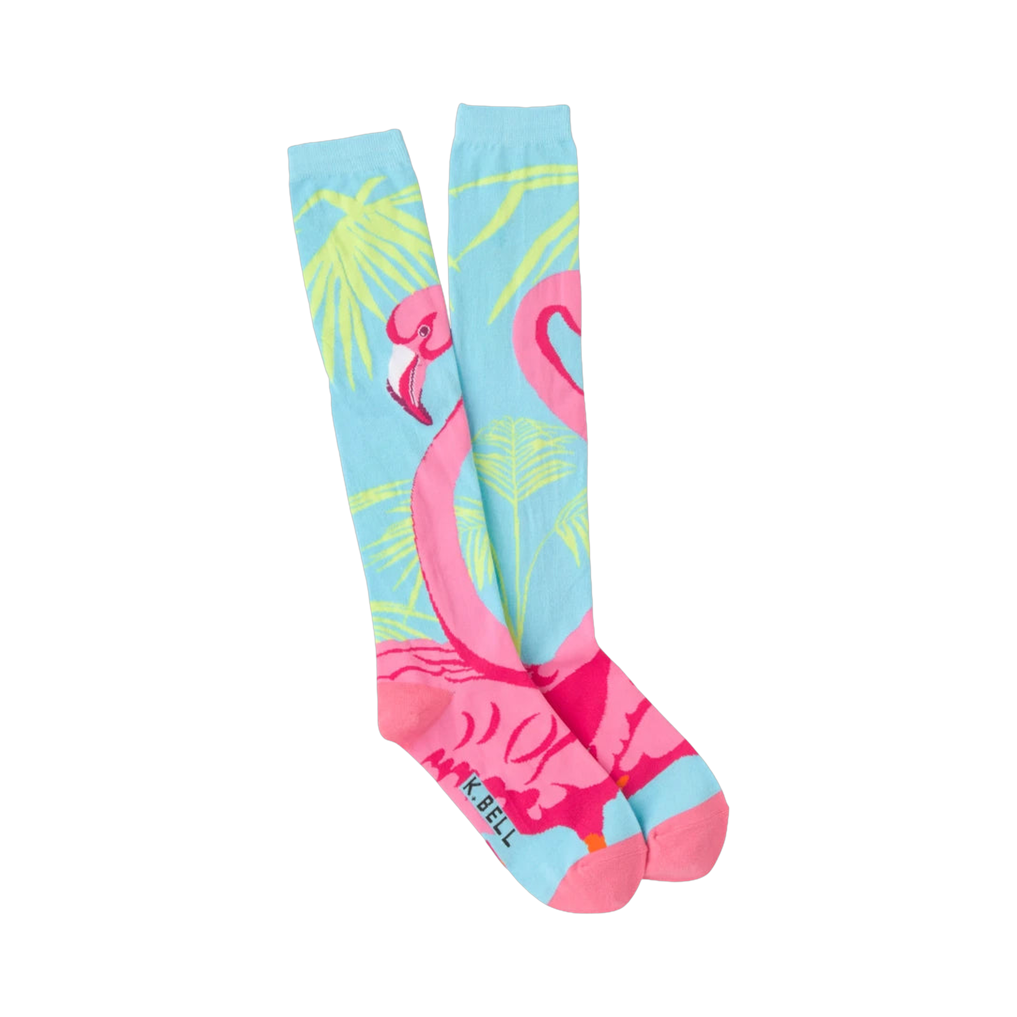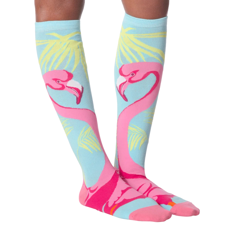When they don't want to listen, you may be forced to put your foot down. Why not do it in style? These cute light blue knee high socks feature a stunning bright pink flamingo standing beneath palm tree leaves. You'll feel like you are in paradise every time you put them on.