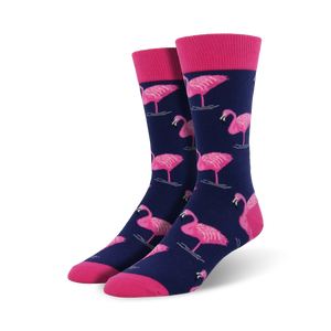 Look no further flamingo fans! Our Flamingo XL socks are sure to make a splash. With their bright pink flamingos standing tall in the light blue water , these dark blue crew socks will have you feeling as fabulous as these birds. Fun fact: Did you know that flamingos have been around for over 3 million years, making them older than the pyramids?
