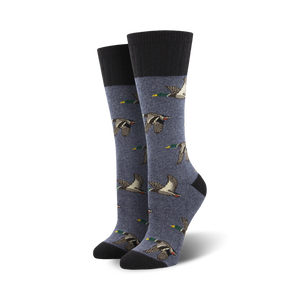Duck, duck, goose! Take to the skies in these Flight Pattern Wool socks, featuring a flock of adorable flying brown and teal ducks against a dark blue background. Perfect for any bird lover, these crew-length socks are sure to become your new favorites. Fun fact: mallard ducks can fly up to 60 miles per hour!