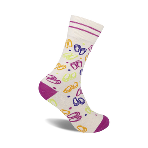 Picture this: you're kicking back on a warm summer day with these crew-length cotton blend socks with a playful pattern of multi-colored flip- flops on a white background. The purple heel and toe add a pop of color, while the two thin white stripes at the top add a touch of preppy style. Whether you're lounging by the pool or cruising the boardwalk, these socks will keep your feet feeling comfy and looking fly. Plus, you can show off your love for summer and free- spirited vibes wherever you go.
