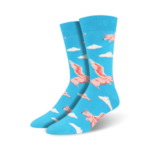 Are you a skeptic? Are you a pessimist full of doubt? Do you enjoy telling people impossible things will only happen when pigs fly? Then these crazy men's novelty socks are perfect for you! Each fun pair features fluffy clouds and pigs with wings printed all over on a sky blue background.