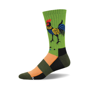 Brighten up your wardrobe with a splash of farmyard funk! Our "Folk Art Rooster" socks boast a vibrant, eye-catching rooster in a pallette of red, yellow, blue, and black, strutting confidently against a lush dark green backdrop. With a pop of orange and black on the toes and heels, these crew-length socks combine whimsy with a cheeky edge, perfect for pecking around town or crowing at any casual hangout. Why not ruffle some tail feathers at your next friends' gathering with these clucking fantastic socks?