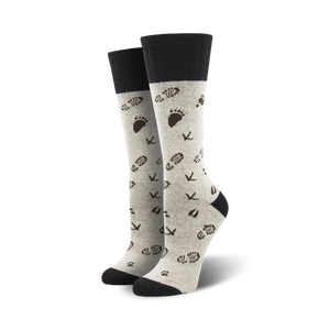 Get on track with the Follow the Tracks Wool Socks. Designed for both men and women, these crew socks feature a cute and playful pattern of bear footprints and bird tracks against a gray background with black toes, heels, and cuffs. Rock these socks with your favorite boots and head out for an adventure in style. Fun fact: The blackbird is North America's most common bird species.
