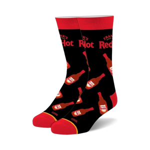 Frank's RedHot Bottles Socks: For When You Want to Spice Up Your Feet! Did you know that Frank's RedHot is the secret ingredient to a delicious Buffalo Chicken Sandwich? These Frank's RedHot Bottles socks are sure to add some flavor to your sock drawer or your next party. With their fun and funky pattern of red and white bottles, these socks are sure to be a hit among foodies and spice enthusiasts alike. And they're just the right amount of spicy - not too hot, not too mild. So grab a pair and let your feet join the flavor party!