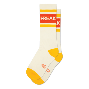 Time to let your true colors show with these socks. They rock a classic athletic vibe in cream, bold red, and bright yellow. Up top, you've got two clear yellow stripes bracketing a solid red band. The word 'FREAK' is visible in white letters across that red stripe on one sock, with the start of the word showing on the other. Down by the heel and toe, it's all sunny yellow. Plus, there are small red abstract symbols visible on the side of the foot, below the ankle. Perfect for days you feel like marching to your own beat.